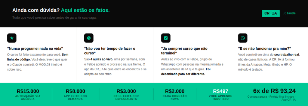 O curso tem aulas gravadas e ao vivo. As gravadas você já tem. As ao vivo são onde tudo acontece, mas não ficam disponíveis depois. Essa opção garante acesso às gravações, incluindo o hackathon final. É a única forma de não perder.
