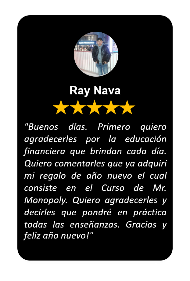 "Gracias Sociedad de Caballeros y Como Jugar Monopolio. Ha sido realmente un gran curso, donde pude aprender desde cero todos los conceptos y estrategias para incursionar en este increíble rubro. Muy didácticas y entretenidas las clases. Al igual que tú Juan (si es que ese es el nombre de quien dictó este curso) también soy Ing Civil y no había tenido esta perspectiva sobre los inmuebles. Nos veremos seguramente en La universidad de Mr Monopoly y porque no, en un futuro como socios de proyectos ambiciosos. Para finalizar, a quien lea este comentario, recomiendo enormemente este curso y los artículos que ofrecen, es contenido de muy alta calidad y mantienen una comunidad activa e informada de diferentes temas. Verdadera educación financiera e información de como funciona este sistema. Saludos! "