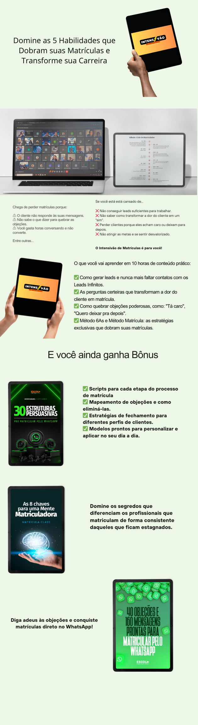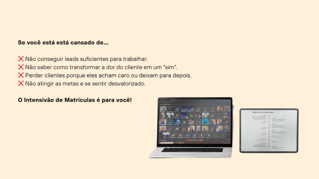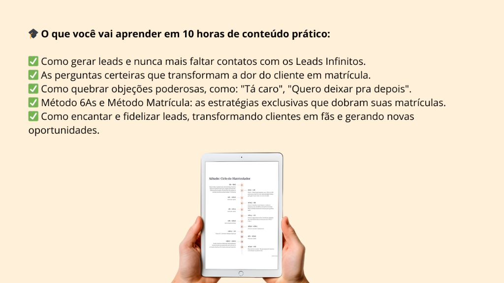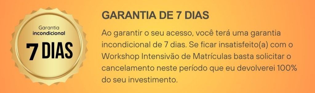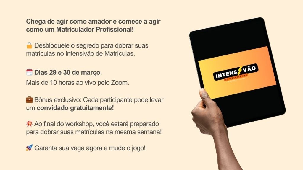 Garanta a gravação completa do Intensivão de Matrículas e tenha acesso ao conteúdo que vai dobrar o seu número de matrículas. ✅Você pode garantir acesso às gravações, em formato de aulas, e a todos os materiais que utilizaremos no evento para ver e rever quantas vezes desejar, sem depender apenas das anotações que fará durante a transmissão ao vivo. Serão mais de 5h de conteúdo. E, o mais importante: esse investimento vira um cashback que poderá ser utilizado para entrada na próxima turma.