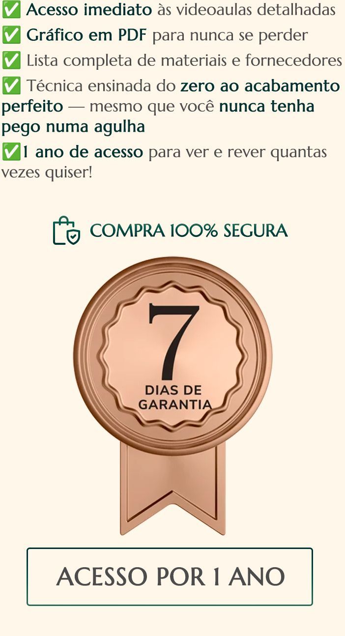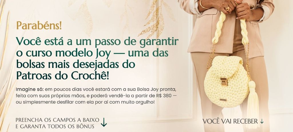 đ OFERTA ESPECIAL: Torne-se uma MESTRA do CrochĂȘ com acesso completo! VocĂȘ estĂĄ prestes a começar uma jornada incrĂvel com a bolsa Joy Mas que tal dar um passo alĂ©m e garantir o curso Mestres do CrochĂȘ com TODOS os modelos inclusos e atualizaçÔes? âš Com essa oferta exclusiva, vocĂȘ vai: Ter acesso ao catĂĄlogo completo de bolsas de luxo Receber todos os novos modelos lançados durante o perĂodo do curso, sem precisar comprar avulso â Oferta vĂĄlida somente agora, no momento da sua inscrição.