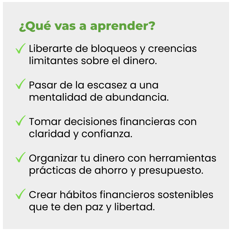 Aterriza o profundiza lo que aprenderás en Reprogramación Financiera en una sesión uno a uno conmigo. Te acompaño en la construcción de tu plan de acción.