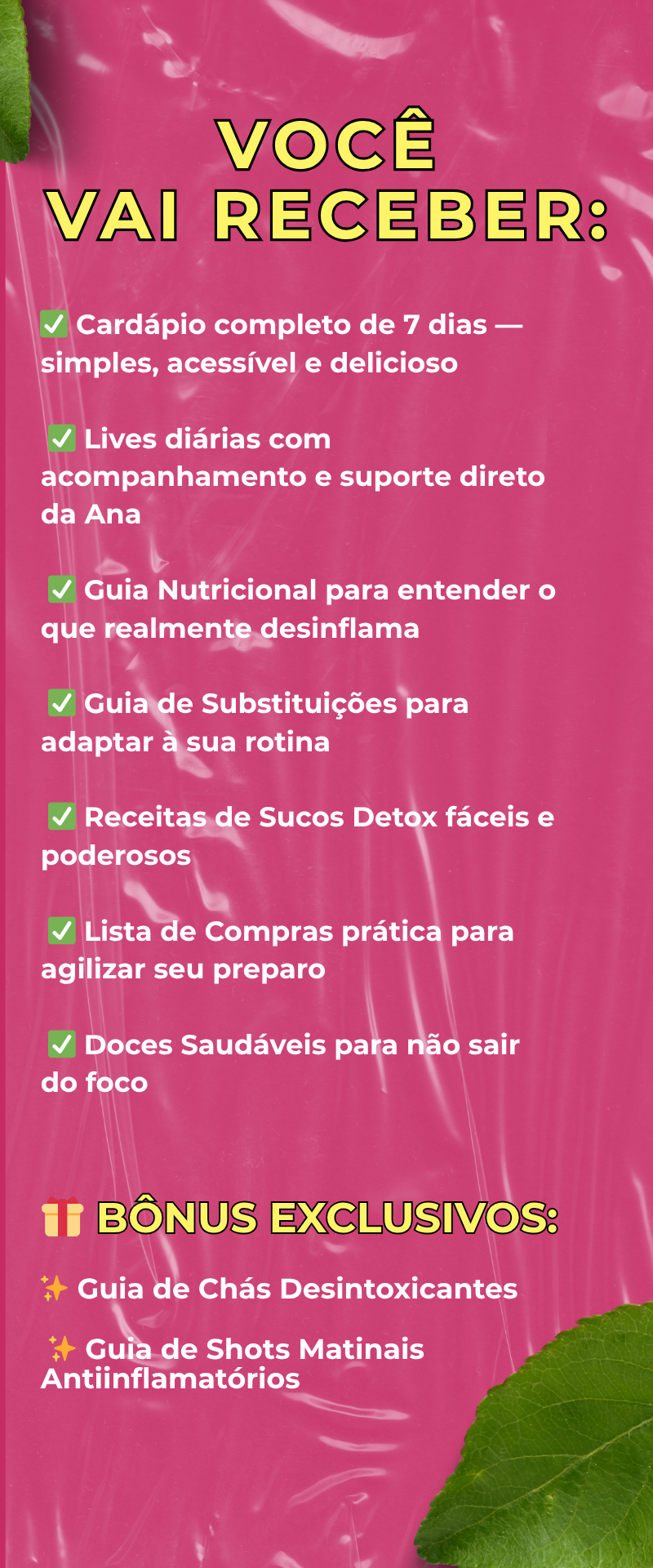 🍋 SÓ HOJE DE R$47,00 POR APENAS R$17,00! ⚠ 83% das alunas do Desafio Detox decidem levar o Guia de Receitas de Sucos Detox para potencializar seus resultados e acelerar o emagrecimento. Receba um material exclusivo com sucos naturais, anti-inflamatórios e diuréticos, perfeitos para desinchar, aumentar a energia e potencializar a queima de gordura durante o seu detox. 💚