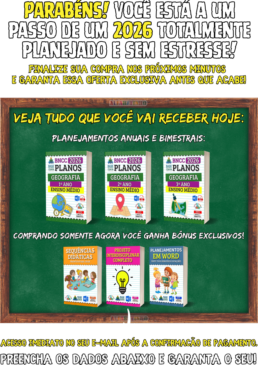 BNCC 2026. perfeitas para uso imediato. 🎁 GANHE BÔNUS EXCLUSIVOS: 1️⃣ PLANEJAMENTOS EM WORD 2️⃣ ATIVIDADES EM WORD 3️⃣ GABARITOS DAS ATIVIDADES 4️⃣ 32 PLANOS DIÁRIOS 5️⃣ 24 PLANOS SEMANAIS 6️⃣ 16 PLANOS MENSAIS 😱 DESCONTO IMPERDÍVEL, APENAS AGORA!