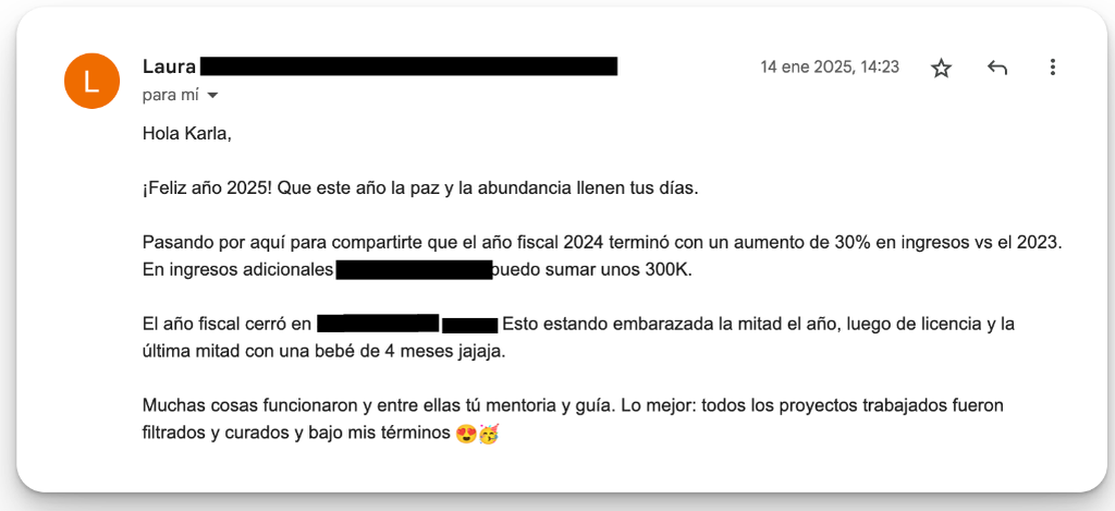 Para Laura, esta reingeniería de sus servicios le apoyó a cerrar US$26,000 en The Service Lab, y seis meses después cerrar el año con un aumento de un 30% en su conversión... todo esto estando embarazada y aún así escogiendo clientes bajo sus términos.