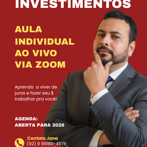 Faça seu dinheiro ($) trabalhar pra você! Aula individual agendada (1:45h) ao vivo via zoom direto na prática, do básico ao avançado. Comece agora mesmo. Agendamento no telefone (92) 9 9180-4576 Jana