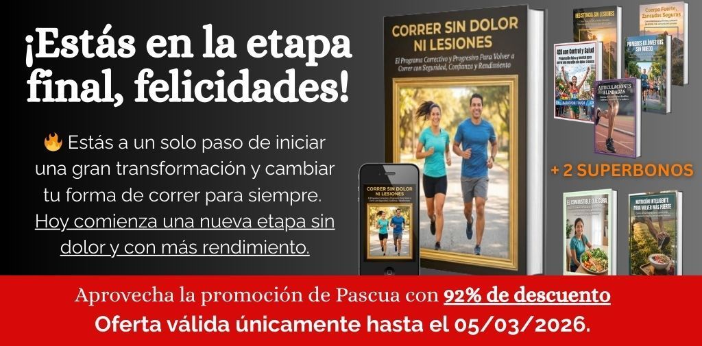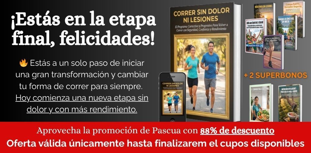 Com un DESCUENTO ESPECIAL SOLO AQUÍ, reúnes todas las herramientas clave para correr sin dolor, sin miedo y sin lesiones. Incluye guía de calzado ideal, movilidad y estabilidad, rutina antidolor, checklist preventivo y reprogramación mental. Un sistema completo que protege tu cuerpo, acelera tu progreso y te da la seguridad de entrenar como un atleta profesional desde el primer día.
