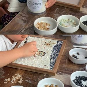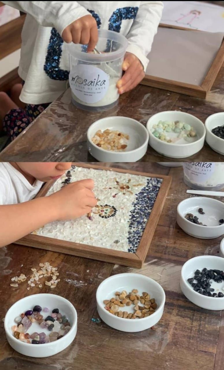 - A criança fará um mosaico em pedras em uma moldura em madeira de lei, e quando finalizada estará pronta para pendurar.
