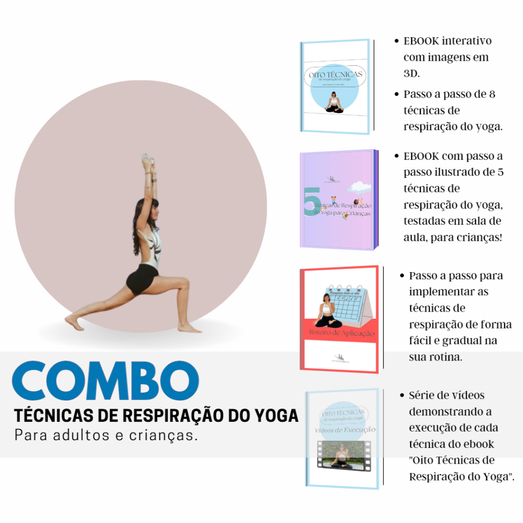 Além de conter um ebook interativo com o passo a passo de 8 técnicas de respiração do yoga para adultos com um capítulo dedicado aos mecanismos da respiração e imagens em 3D, este Combo contém: