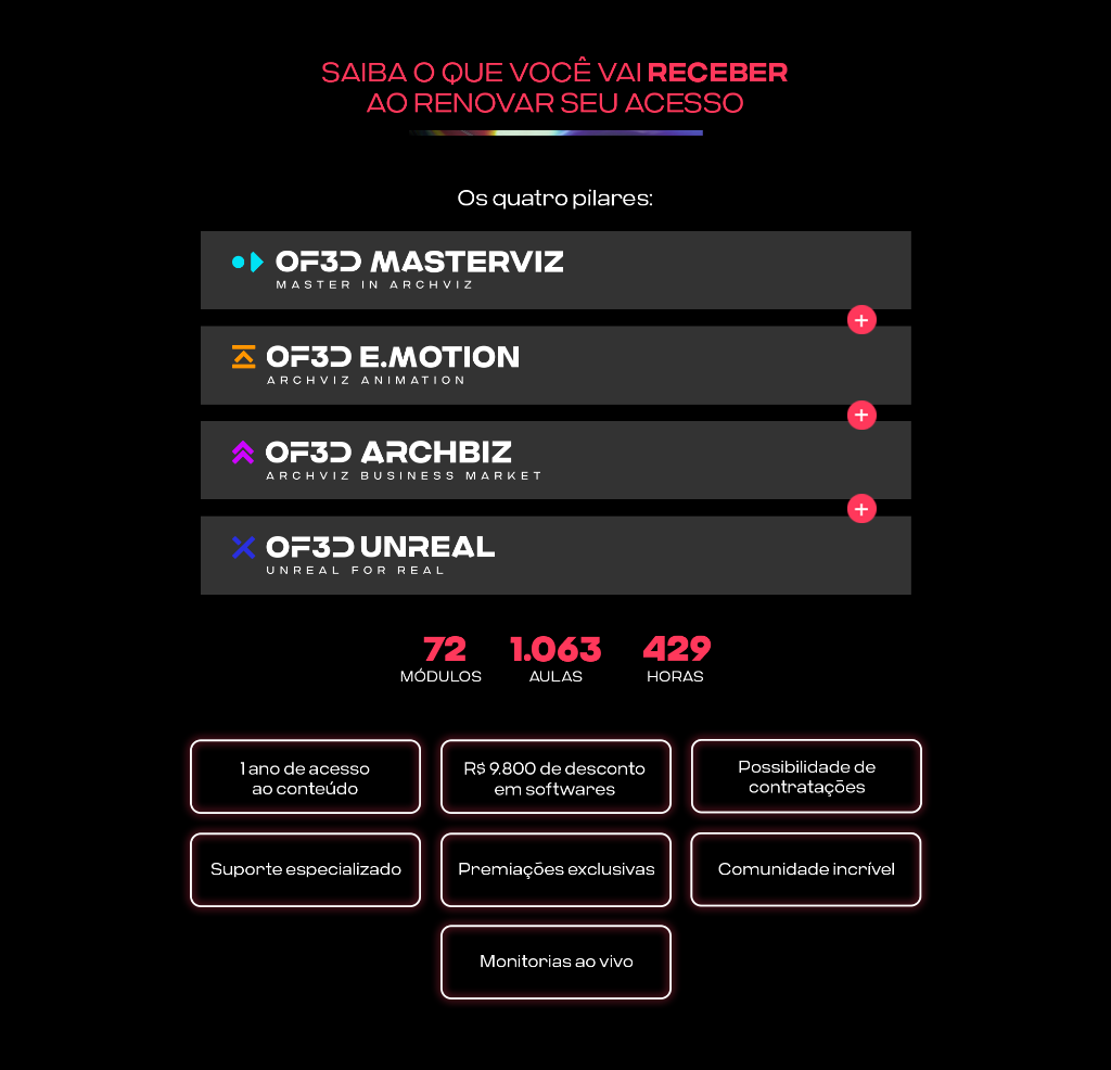 Estenda seu acesso ao curso OF3D FULL por mais 6 meses por apenas R$ 485,00 à vista ou em 12x de R$ 48,40! Com esse tempo extra, você poderá aprofundar suas habilidades em renderização avançada e refinar seu olhar artístico, garantindo 1 ano e 6 meses de acesso total para dominar o conteúdo no seu próprio ritmo.