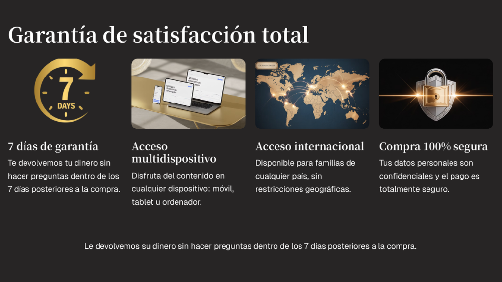 Facilita las noches con amor y tranquilidad. Este complemento exclusivo de Durmiendo Solitos trae guías prácticas, rutinas visuales e imprimibles y un bono especial con cuentos relajantes. Ideal para padres que buscan una transición suave y segura al sueño independiente.