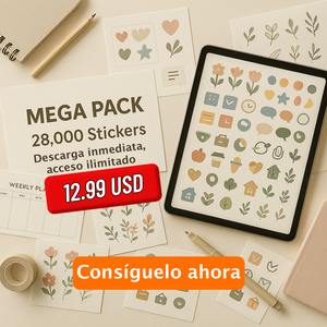 Con este Mega Pack tendrás una colección enorme de stickers creativos para personalizar tus diseños, agendas digitales, bullet journals, scrapbooking, imprimibles y mucho más
