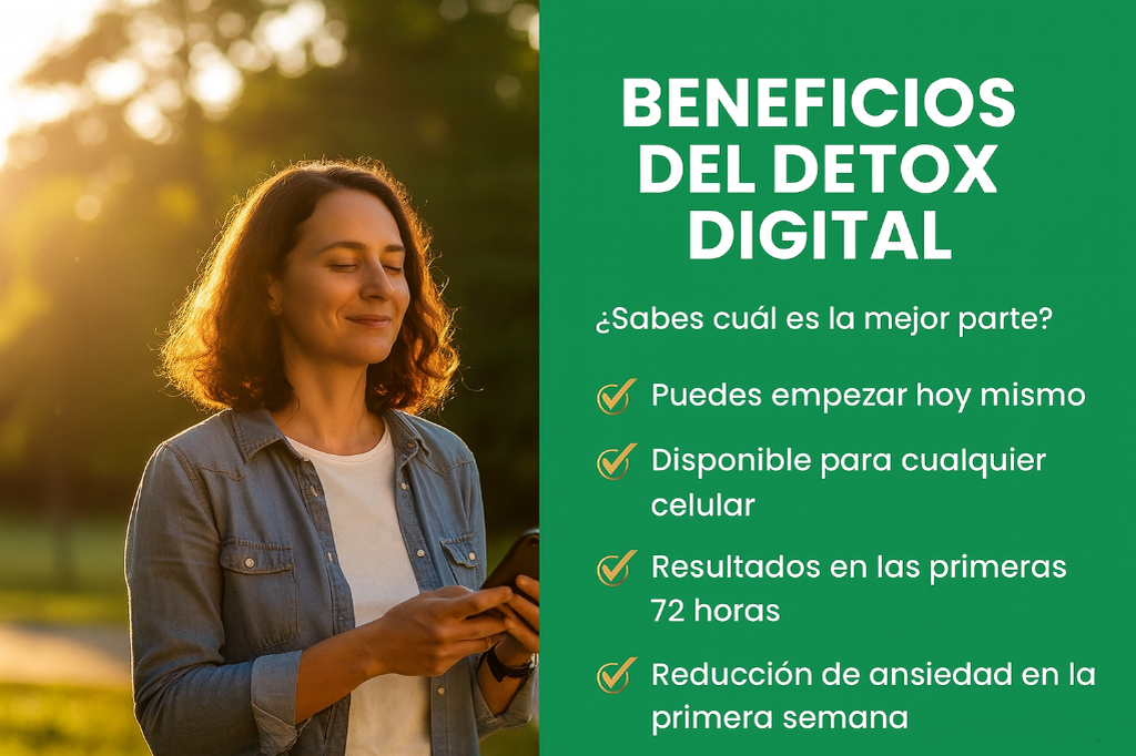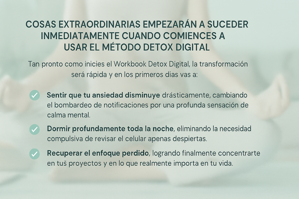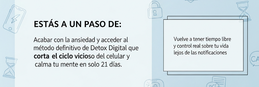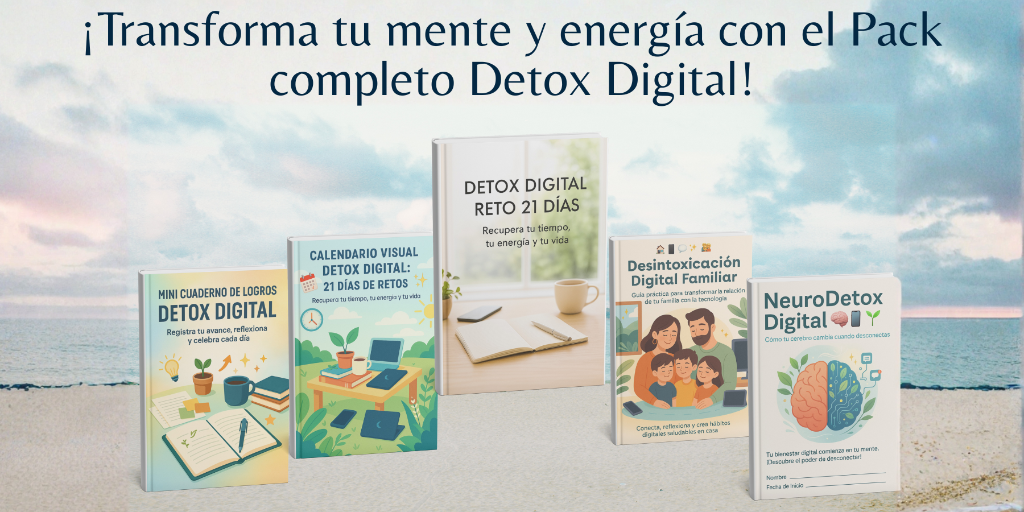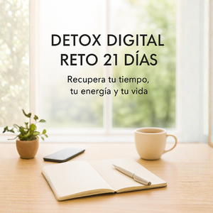 Recibe al instante el Workbook Detox Digital (21 Días) + 4 Bonos Exclusivos (Guía Neurohábitos, Detox Familiar, Calendario y Diario). ¡Recupera tu tiempo hoy!