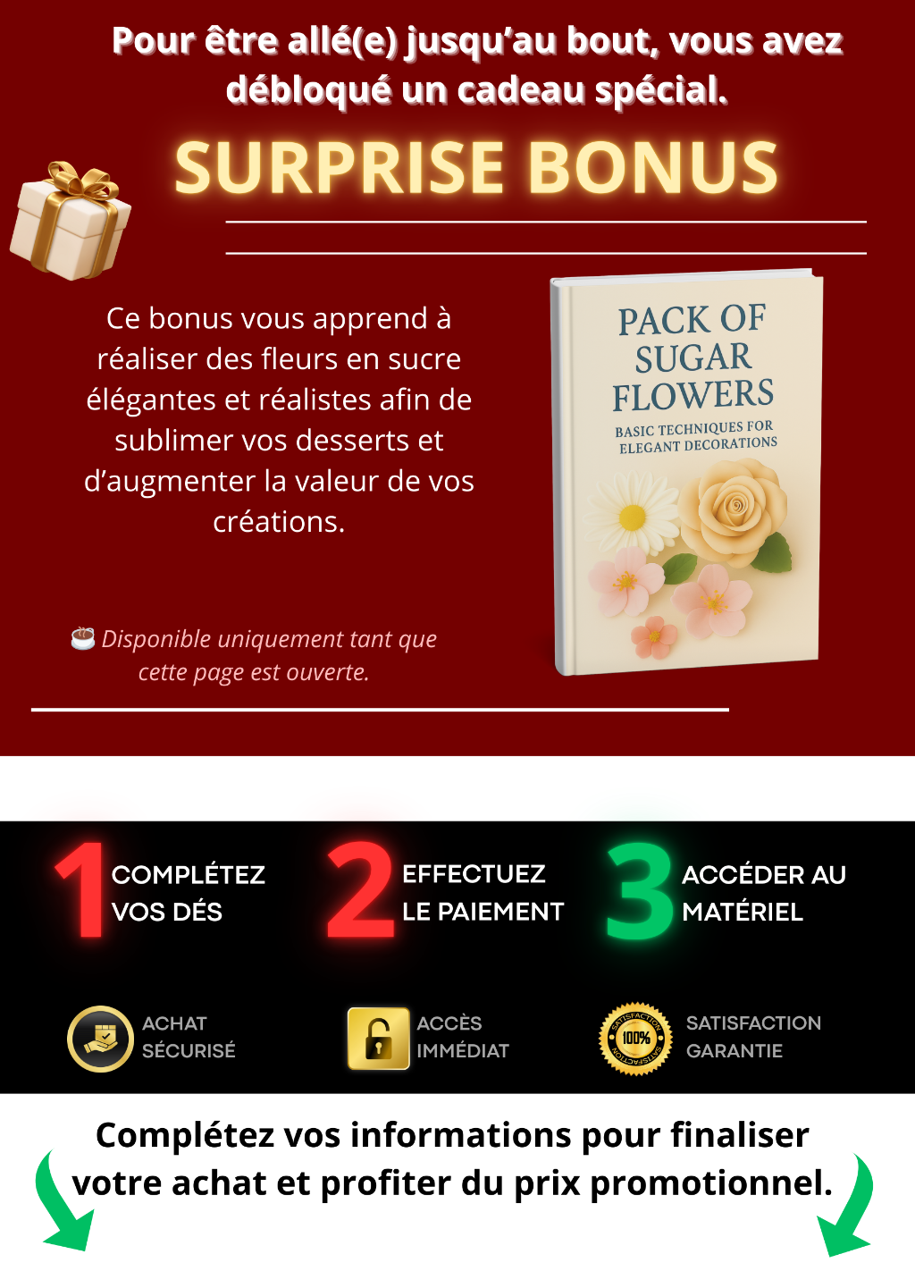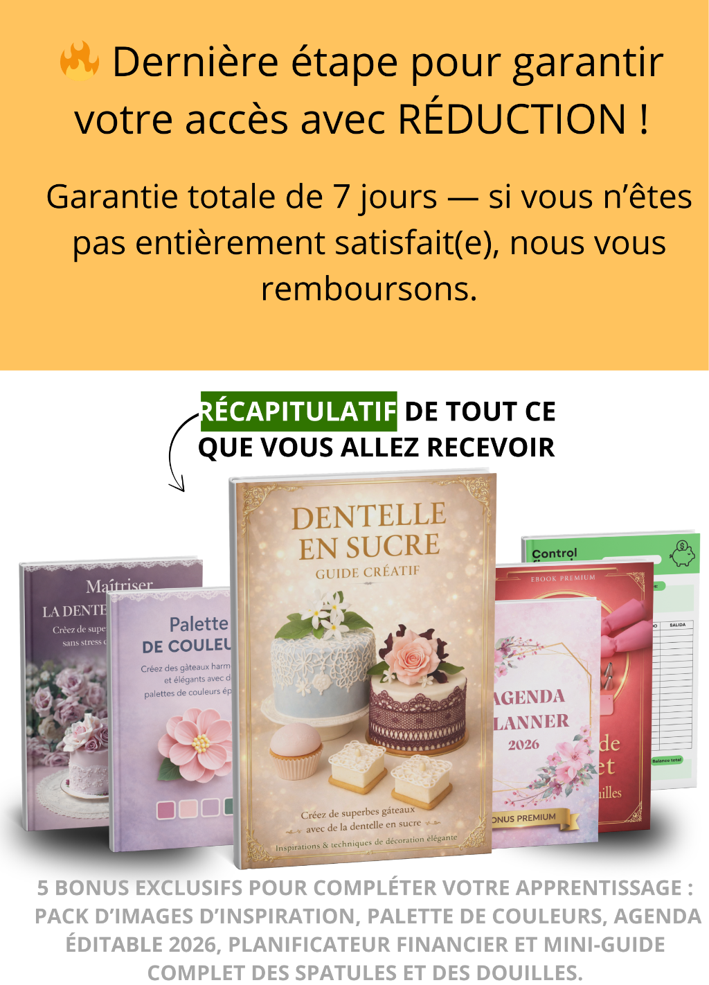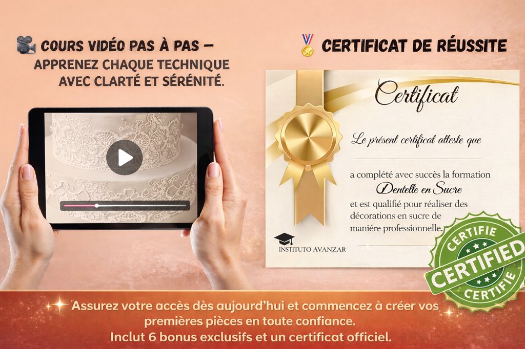 Accélérez vos résultats avec la dentelle en sucre Apprenez à créer une dentelle comestible élégante en quelques minutes, sans erreurs, même lors de vos premières réalisations. Idéal pour appliquer immédiatement ce que vous venez d’apprendre et obtenir des finitions plus régulières et professionnelles. 👉 Ajoutez maintenant et gagnez du temps dès aujourd’hui.