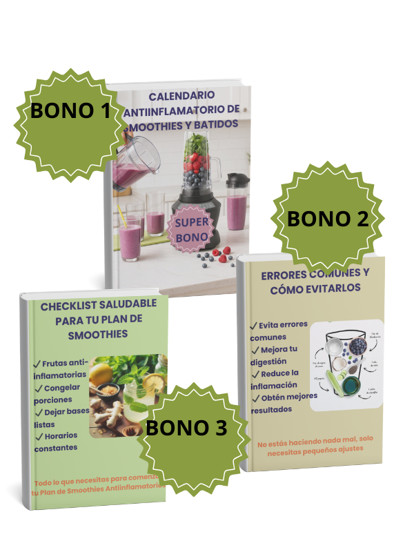 Salud inmediata, sin excusas ¿No tienes tiempo pero sí ganas de sentirte mejor? Este pack de smoothies rápidos te permite preparar bebidas antiinflamatorias, nutritivas y deliciosas en solo 5 minutos, usando ingredientes simples. ✔️ Ideales para mañanas apuradas ✔️ Fáciles, rápidos y efectivos ✔️ Perfectos para mantener el hábito saludable 👉 Sí, quiero agregar los Smoothies Rápidos – Listos en 5 Minutos Ahorra tiempo, cuida tu cuerpo y empieza hoy mismo.