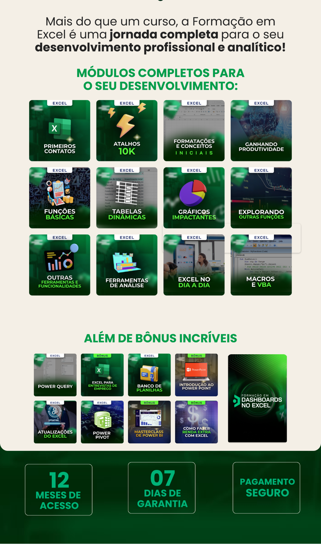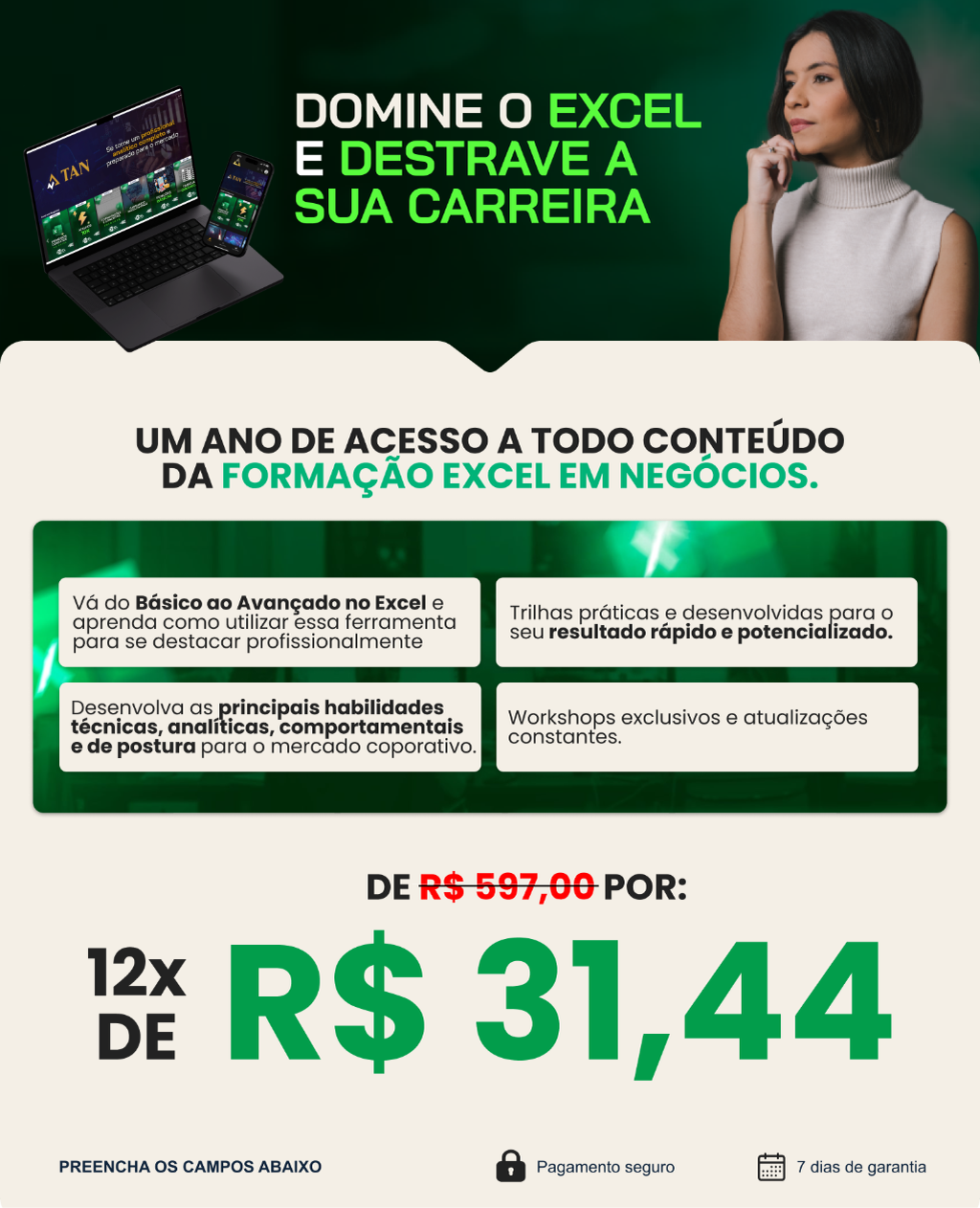 ⚠ 8 em cada 10 alunos decidem levar nossa Formação Excel em Negócios ESTENDIDA. Adquira, agora, mais um ano de acesso (02 anos no total) para aproveitar ao máximo o conteúdo no seu dia a dia 🔥