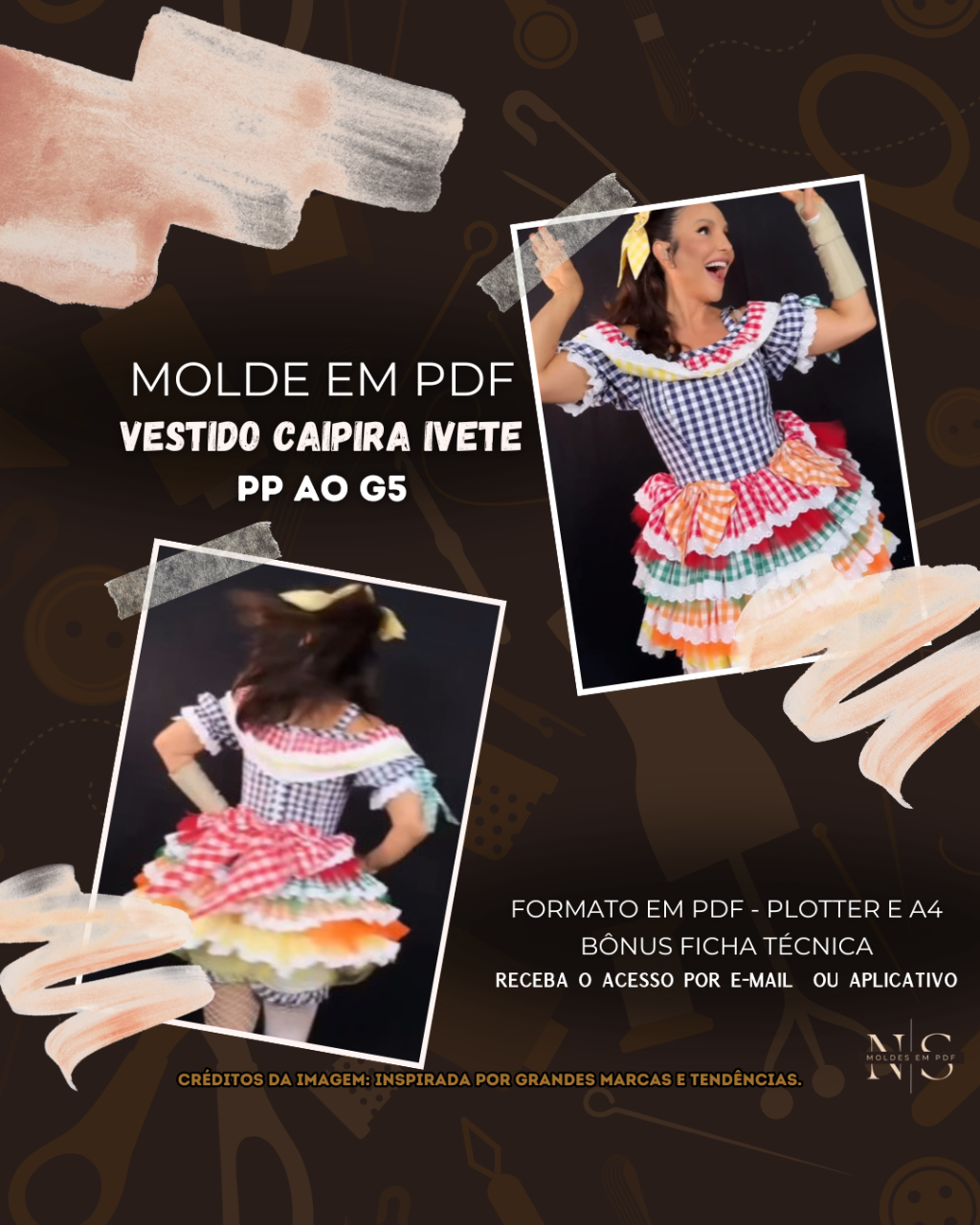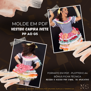 NS Molde em PDF - Vestido Caipira Ivete (Vestido Estilo Festa Curto Ombro a Ombro Alça com Babados em Camadas Zíper Atrás)
