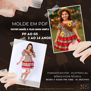 NS Molde em PDF - Vestido Mamãe & Filha Maria Bonita (Vestido Estilo Festa Curto Ombro a Ombro Saia com Babados Elastex na Cintura)