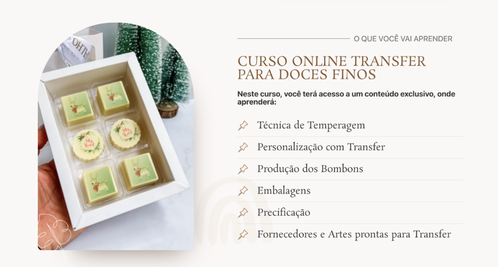 •Técnica de temperagem •Personalização com transfer •Embalagens •Produção dos bombons •Precificação •Fornecedores e Artes prontas para transfer •Certificado de conclusão