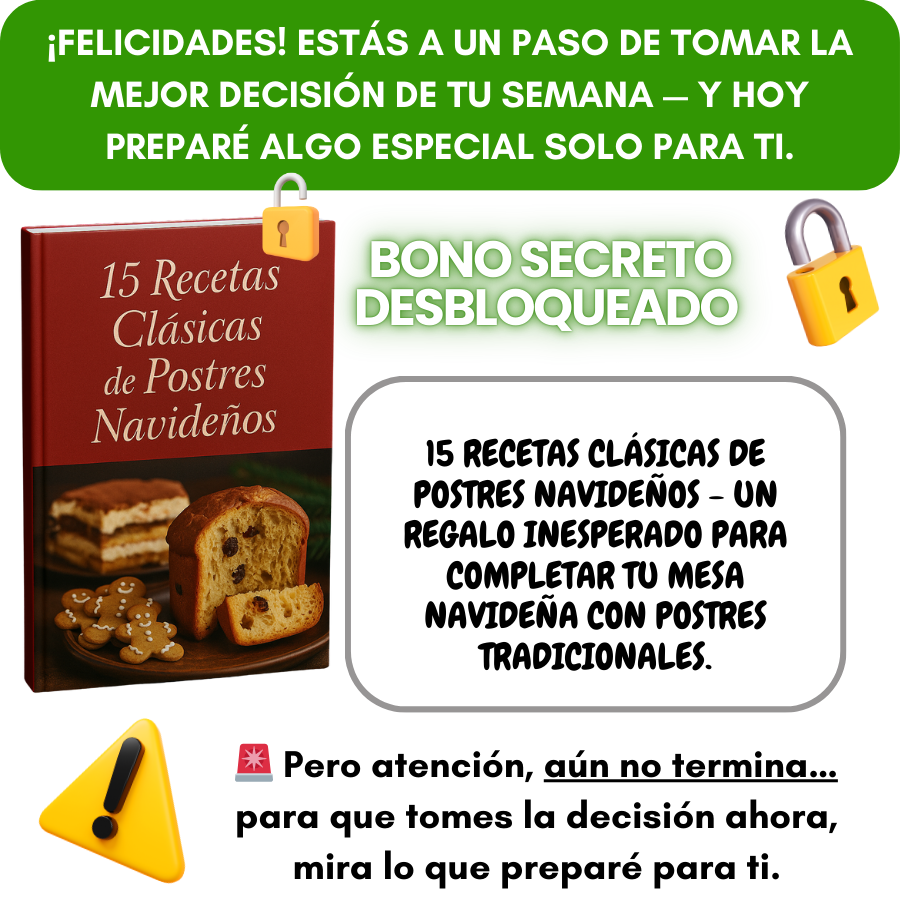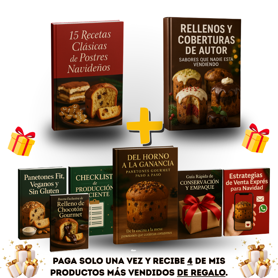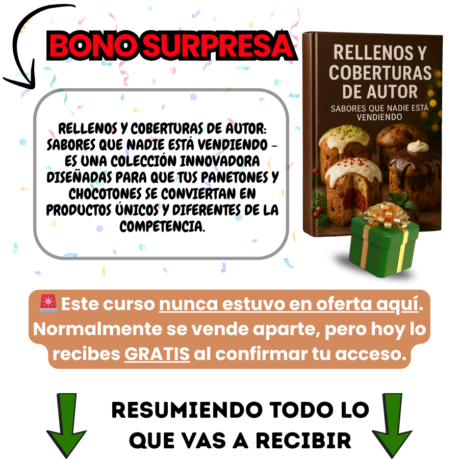 Llévate los 3 cursos de arriba en un solo pack especial. Son tres de mis programas más queridos y vendidos, reunidos con un 40% de descuento exclusivo. ⚡ Esta oportunidad aparece solo en esta página y solo por hoy — después el valor vuelve al normal. No encontrarás este pack en ningún otro lugar. ✔Guía de Recheios Premium para Panetones y Chocotones ✔ Recetario de Galletas Navideñas Tradicionales y Decoradas ✔Guía de Bocaditos Navideños Salados 👉 Agrega ahora mismo los 3 en 1 a tu compra.