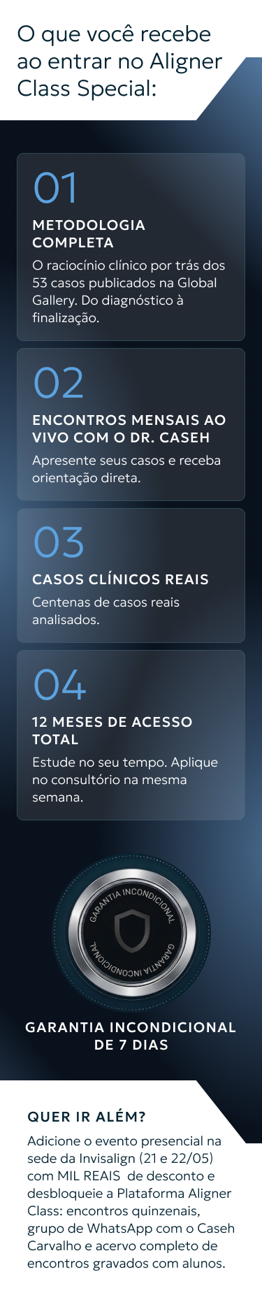 Adicione o evento presencial com MIL REAIS de desconto e ganhe acesso à Plataforma Aligner Class. Dias 21 e 22 de maio, evento presencial na sede da Invisalign em São Paulo. Dois dias de imersão com o Dr. Caseh. E ao adicionar, você ainda desbloqueia a Plataforma Aligner Class: Ganhe acesso ao Grupo de WhatsApp com o Caseh Carvalho, encontros quinzenais ao vivo e o acervo completo dos encontros. Evento + plataforma. Tudo num único passo.