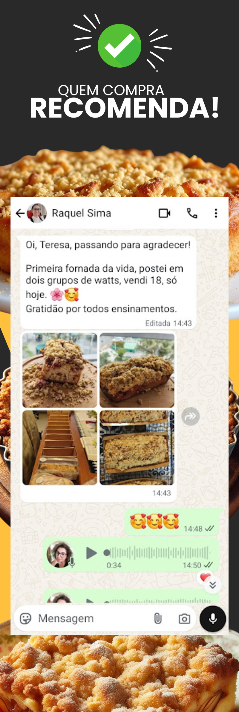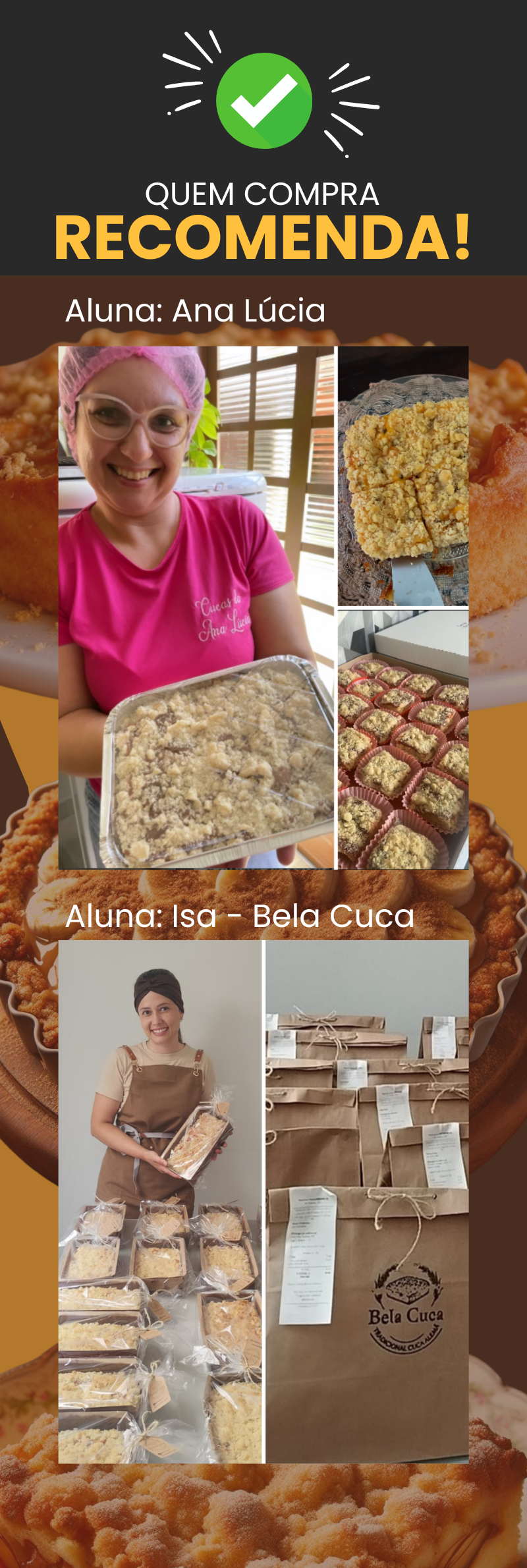 🔥 Adicione o Acompanhamento Individual e Acelere Seus Resultados! Tenha acesso a uma mentoria individual comigo, onde eu te ensino do zero a fazer a massa de cuca artesanal, criar recheios que vendem, corrigir erros e ainda te orientar sobre preços e vendas. Ideal para quem quer segurança, clareza e não quer errar no começo. Um acompanhamento próximo para encurtar o caminho até a primeira venda.
