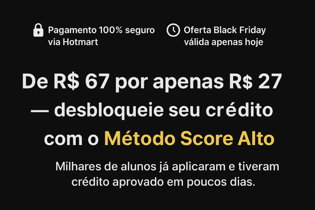 💳 Guia dos Cartões que Mais Aumentam o Score De R$27 por apenas R$7 — Oferta Exclusiva da Black Friday! Descubra os cartões que fazem seu Score disparar e quais evitar! Saiba quais bancos mais aprovam e como usar o cartão certo pra turbinar seu crédito em poucos dias. ✅ Lista atualizada com os cartões que mais aumentam o Score ✅ Estratégias práticas para ser aprovado mesmo com Score baixo ✅ Regras internas dos bancos que ninguém te conta