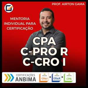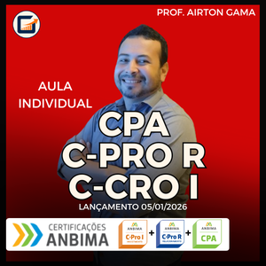 6 aulas individual com prof. Airton Gama. Cada aula tem duração de 1 hora e 30 minutos. Utilize como preparação final para sua prova de certificação financeira CPA ou C-PRO R ou C-PRO I. A aula será via Zoom em data e hora a ser combinada entre as partes.