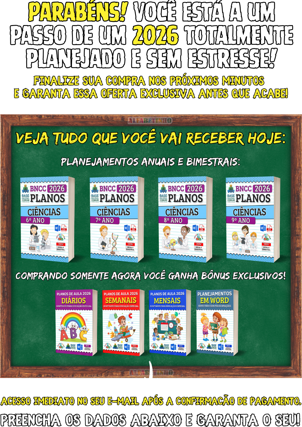 512 Atividades, todas organizadas por Ano e Bimestre, de acordo com a BNCC 2026. perfeitas para uso imediato. 🎁 GANHE BÔNUS EXCLUSIVOS: 1️⃣ ATIVIDADES EM WORD 2️⃣ GABARITOS DAS ATIVIDADES 3️⃣ 32 PLANOS DIÁRIOS 4️⃣ 24 PLANOS SEMANAIS 5️⃣ 16 PLANOS MENSAIS 😱 DESCONTO IMPERDÍVEL, APENAS AGORA!