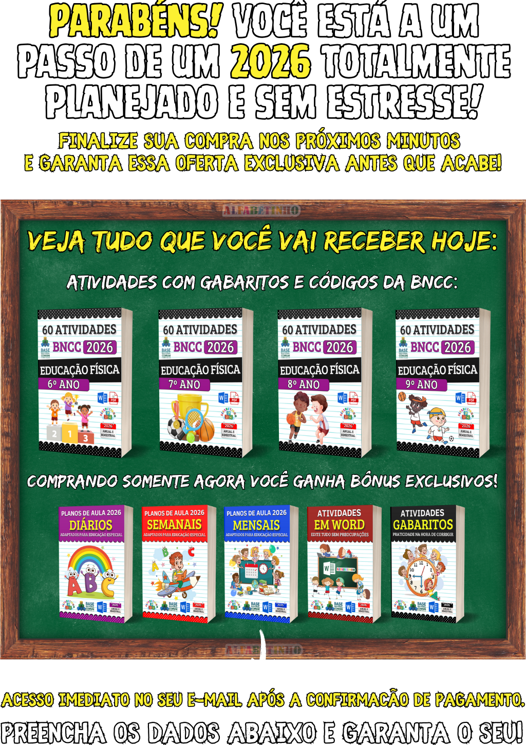 240 Atividades e 210 Planejamentos, todos organizados por Ano e Bimestre, perfeitas para uso imediato. 🎁 GANHE BÔNUS EXCLUSIVOS: 1️⃣ PLANEJAMENTOS EM WORD 2️⃣ ATIVIDADES EM WORD 3️⃣ GABARITOS DAS ATIVIDADES 😱 DESCONTO IMPERDÍVEL, APENAS AGORA!
