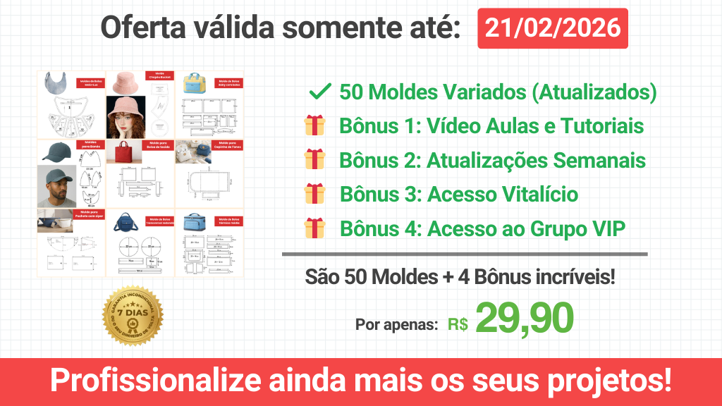 Bolsas vendem o ano todo! Leve 43 moldes exclusivos e fature alto. O pacote inclui modelos de praia, casuais e de passeio. Acessórios têm alta margem de lucro e são fáceis de costurar. Garanta essa promoção por um preço simbólico!