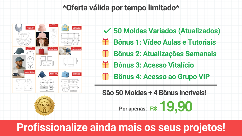 Bolsas vendem o ano todo! Leve 43 moldes exclusivos e fature alto. O pacote inclui modelos de praia, casuais e de passeio. Acessórios têm alta margem de lucro e são fáceis de costurar. Garanta essa promoção por um preço simbólico!