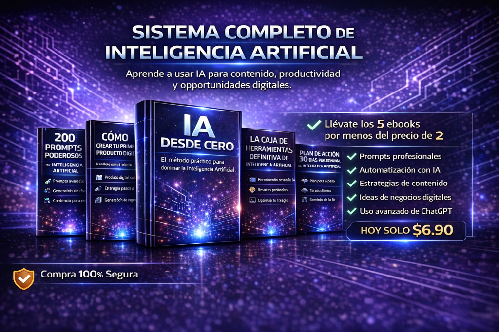 Llévate los 5 ebooks con el mayor descuento. Accede al pack completo de recursos sobre Inteligencia Artificial para contenido, productividad, prompts y oportunidades digitales. ✔ Biblioteca Secreta de Prompts Virales ✔ CHATGPT Master ✔ Automatiza tu trabajo con IA ✔ 15 Negocios Digitales con Inteligencia Artificial ✔ Cómo crear contenido viral con IA