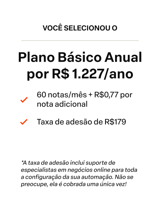 Plano Básico Anual com 60 notas/mês e R$0,77 por nota adicional. Taxa de Adesão R$179,00 (cobrada no 1º mês). Renovação automática anual