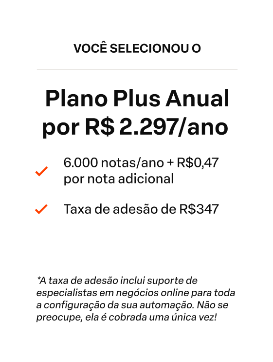 Plano Plus Anual com 6.000 notas/ano e R$0,47 por nota adicional. Taxa de Adesão R$347,00 (cobrada no 1º mês). Renovação automática anual
