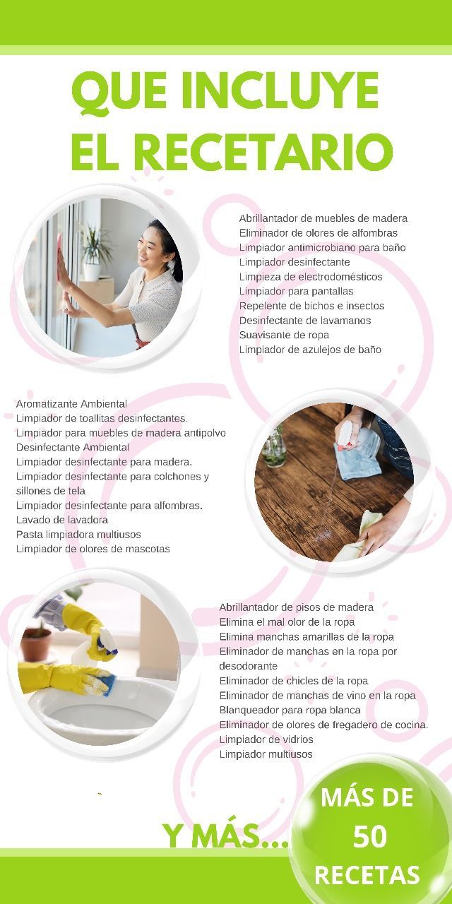 Aceites en Acción es un recetario para preparar tus productos caseros de limpieza e higiene personal. Con este recetario aprenderás hacer un desinfectante ambiental, jabón exfoliante para cuerpo y cara, desodorante para axilas, sérum facial antiarrugas y antimanchas, spray nasal para alergias y descongestionar, roll on para lograr un sueño reparador, jabón liquido antibacterial ideal para cocina y baño, roll on para mejorar la concentración en la escuela y trabajo, roll on para dolores musculares y golpes, enjuage bucal para un aliento fresco, talco para eliminar olores de zapatos, roll on para la indigestión, inflamación y diarrea, roll on para el estrés y relajar a los niños, roll on para dolor de cabeza y migraña, spray para crecimiento de cabello y prevenir la caída.