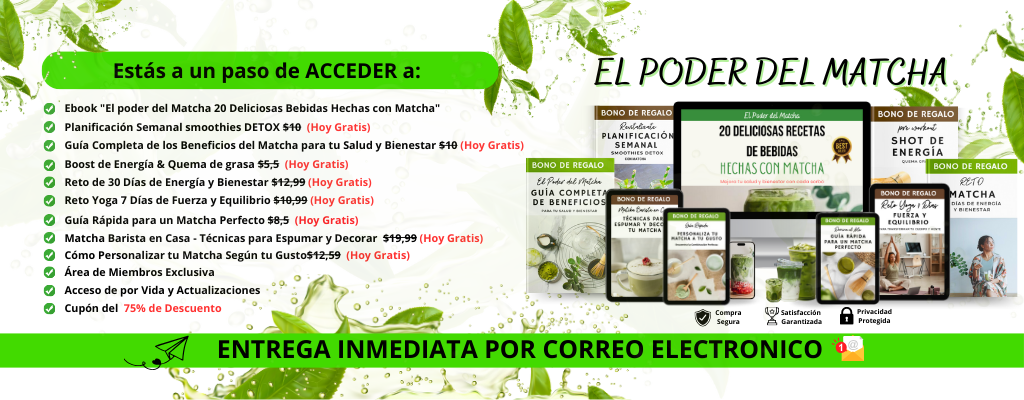 ¡Oferta exclusiva para ti! Lleva 25 recetas de postres saludables hechos con matcha. (Precio regular: $23.96 USD) Hoy, solo para ti: $5.99 USD. Disfruta deliciosos postres llenos de sabor mientras apoyas tu meta de perder peso de forma natural y sin culpas. ¡Aprovecha este precio especial ahora mismo! Oferta válida por tiempo limitado. ¡No la dejes pasar!