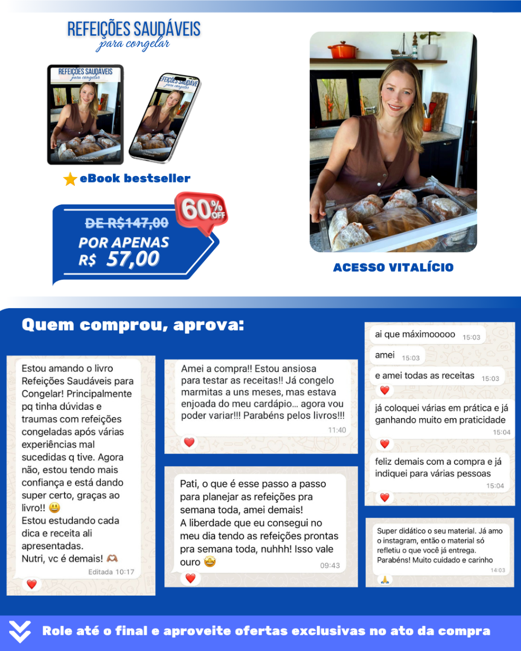 SOMENTE AQUI NESTA PÁGINA. Garanta seu Ebook 110 Receitas Saudáveis com um DESCONTO ESPECIAL!! São 110 receitas (café; da manhã;, almoço, lanche da tarde e jantar) com tabela de calorias, macronutrientes, rendimento e porção sugerida. Acesso vitalício *Ao sair desta página você perderá; essa oportunidade de desconto