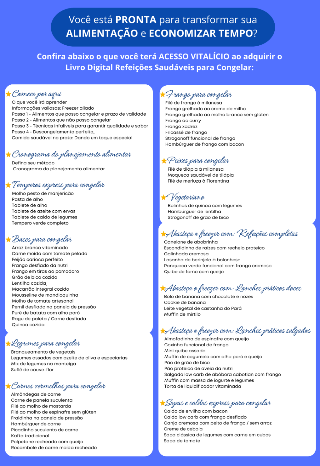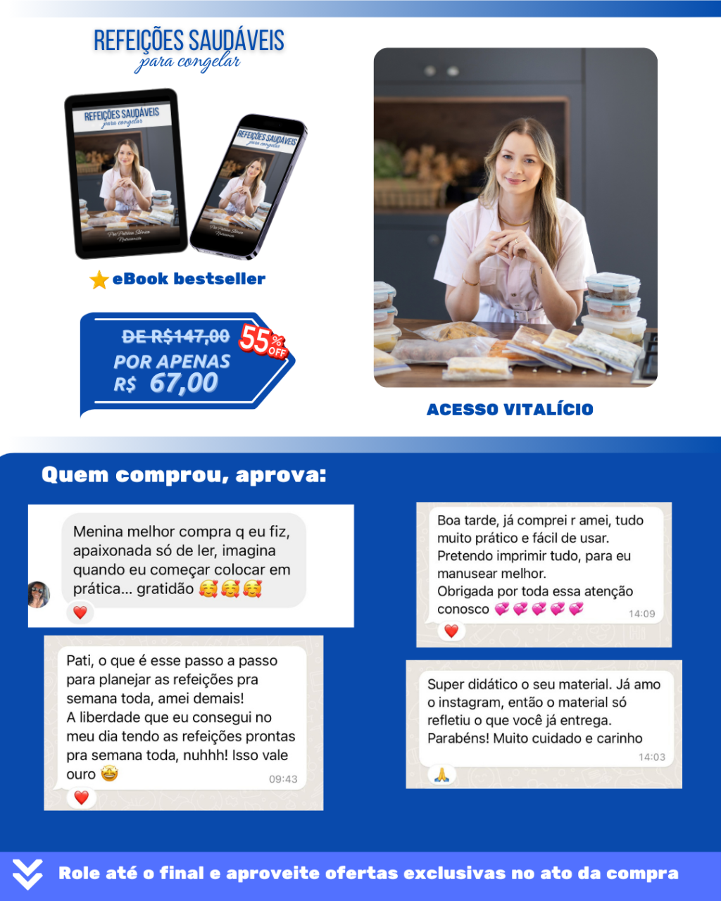 SOMENTE AQUI NESTA PÁGINA. Garanta seu Ebook 110 Receitas Saudáveis com um DESCONTO ESPECIAL!! São 110 receitas (café; da manhã;, almoço, lanche da tarde e jantar) com tabela de calorias, macronutrientes, rendimento e porção sugerida. Acesso vitalício *Ao sair desta página você perderá; essa oportunidade de desconto