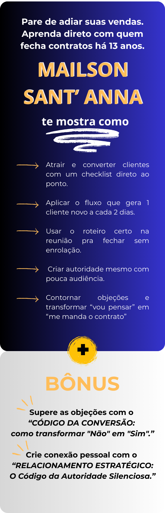 Você vai transformar reuniões comuns em pix na sua conta. Você vai conduzir com postura, dominar objeções e deixar sua autoridade brilhar, mesmo se você for iniciante. - A estrutura ideal para conduzir reuniões de alta conversão; - O que dizer em cada etapa para gerar segurança e direcionamento; - Como criar confiança instantânea mesmo com leads frios; - Técnicas de postura, tom e linguagem corporal para influenciar sem forçar; - Ideal para serviços, consultorias, freelas e produtos premium.