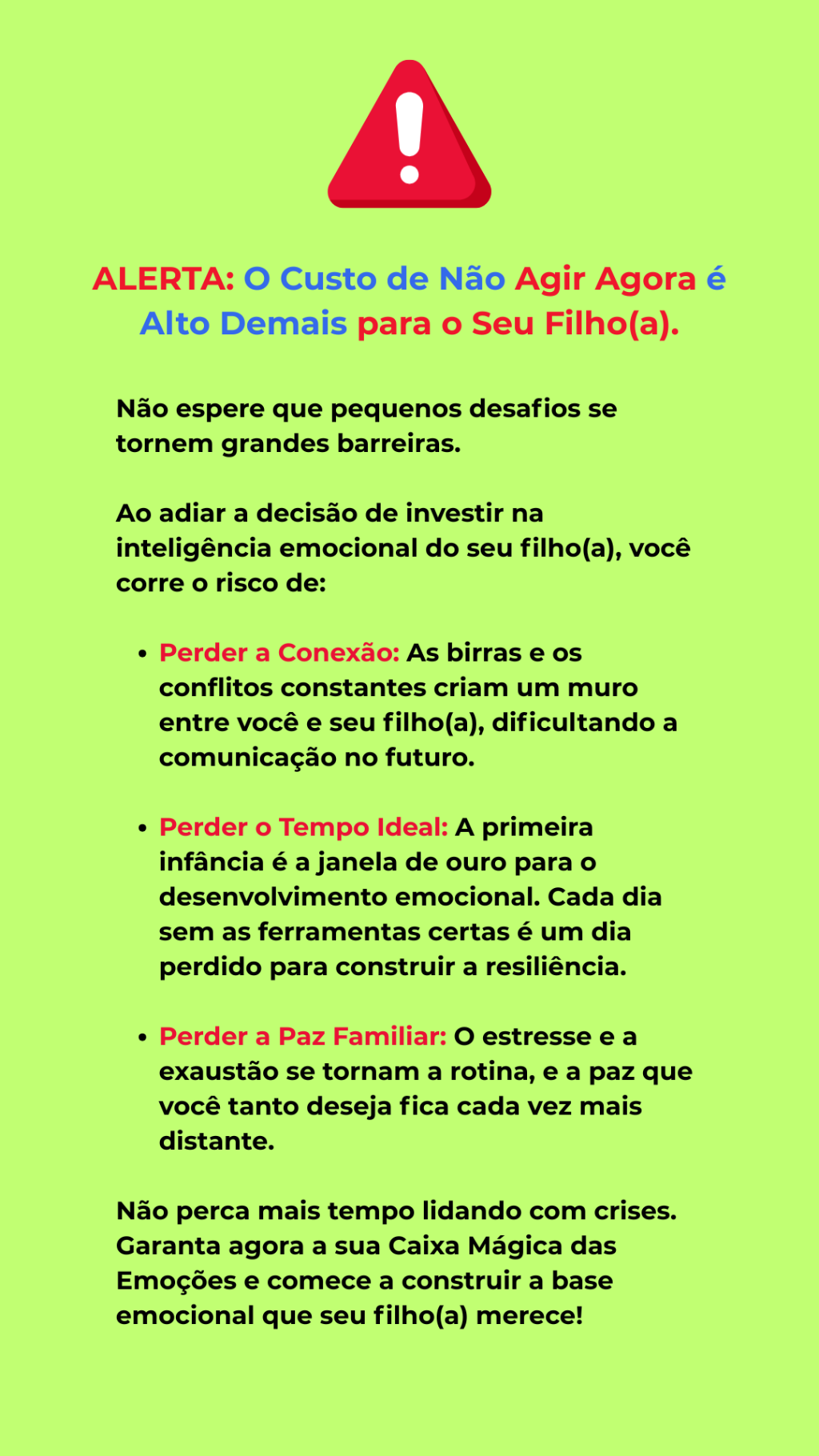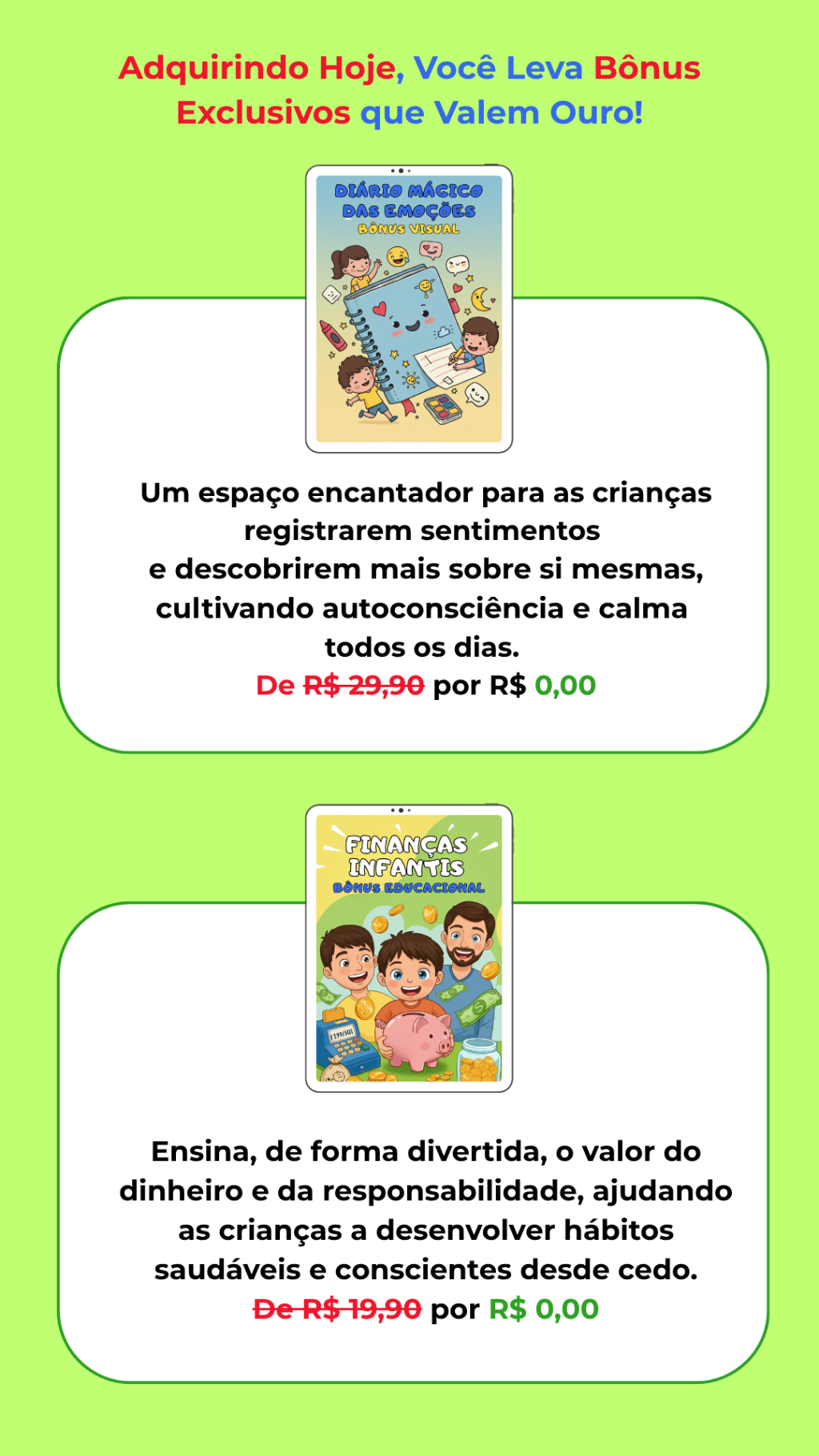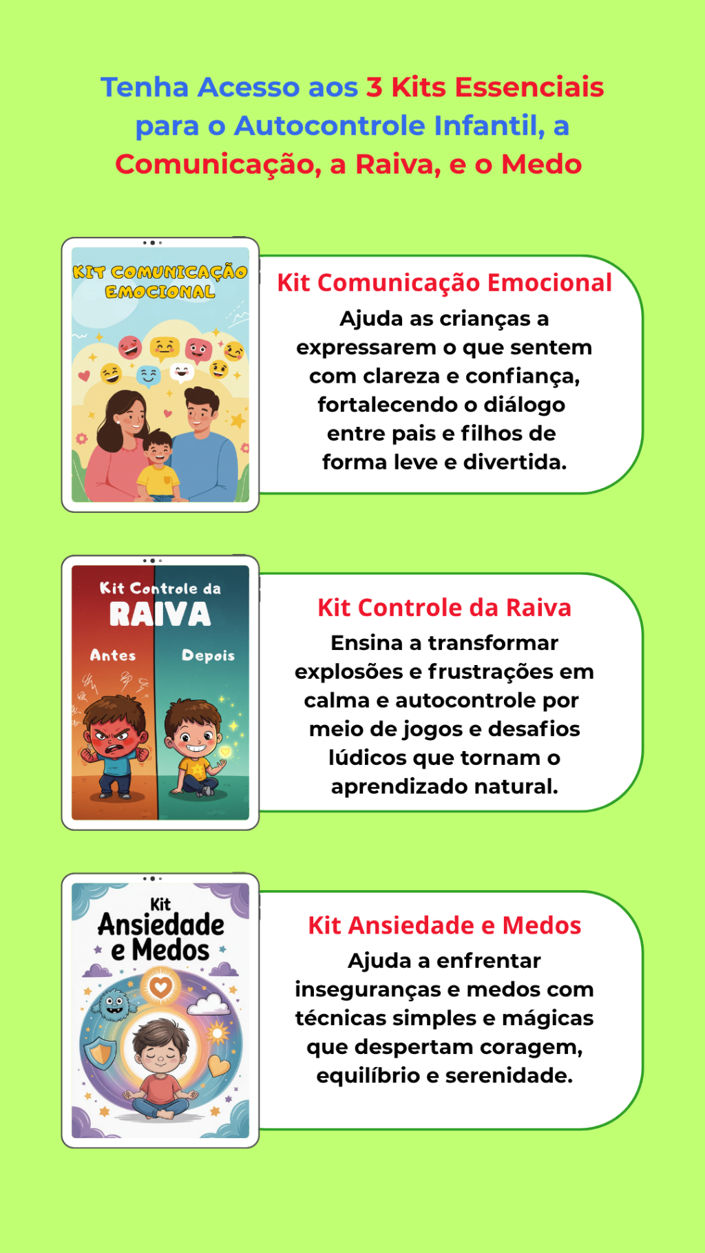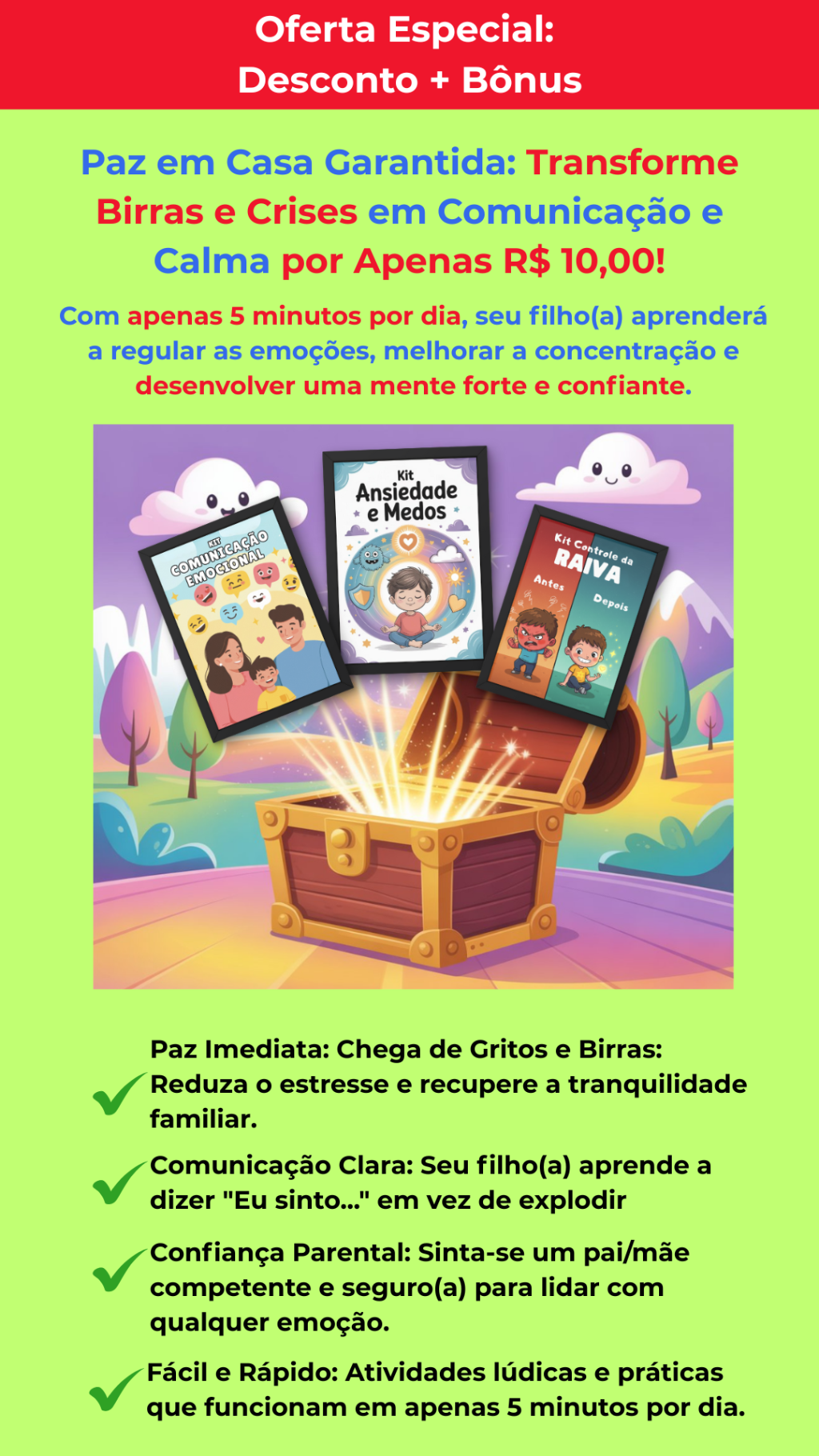 [ ] Sim! Eu quero o Mini Kit Primeiros Socorros Emocionais por R$ 7,00! É o complemento perfeito para a Caixa Mágica, onde ela ensina a entender, e o Kit ensina a acalmar na hora! * Ação Imediata: 3 técnicas para parar a crise em menos de 60 segundos. * Portátil: Leve na bolsa para usar em público. * Paz para os Pais: Recupere o controle e a calma.
