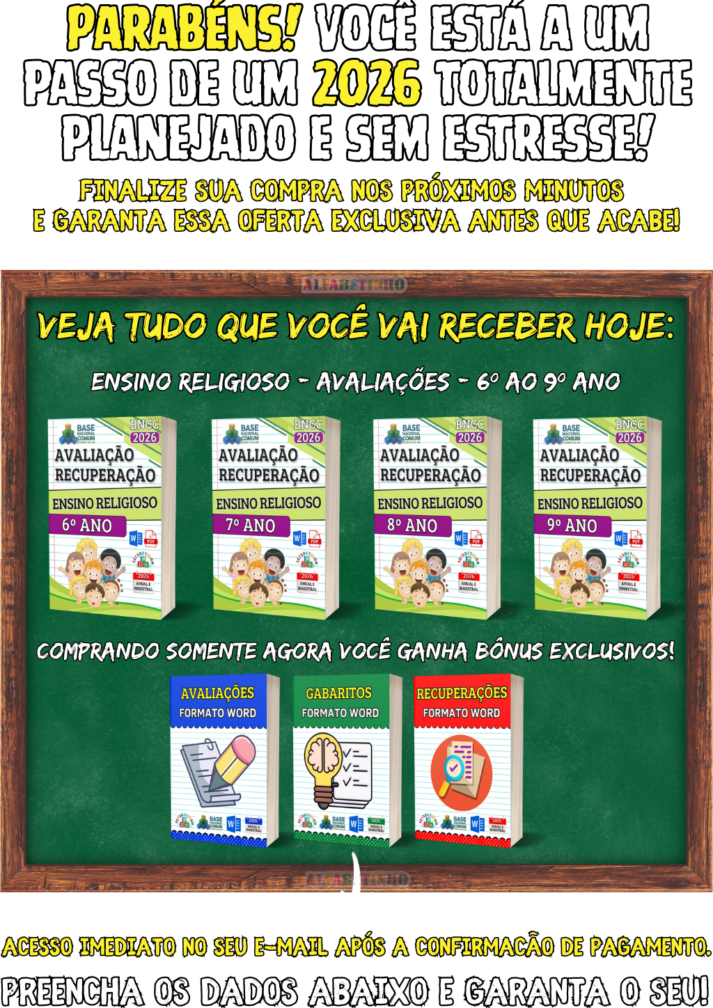 240 Atividades e 128 Planejamentos, todos organizados por Ano e Bimestre, de acordo com a BNCC 2026. perfeitas para uso imediato. 🎁 GANHE BÔNUS EXCLUSIVOS: 1️⃣ PLANEJAMENTOS EM WORD 2️⃣ ATIVIDADES EM WORD 3️⃣ GABARITOS DAS ATIVIDADES 4️⃣ 32 PLANOS DIÁRIOS 5️⃣ 24 PLANOS SEMANAIS 6️⃣ 16 PLANOS MENSAIS 😱 DESCONTO IMPERDÍVEL, APENAS AGORA!