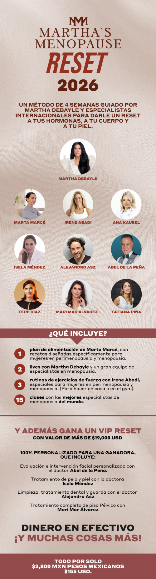 El único programa en México que cuida de tu menopausia Un método de 4 SEMANAS guiado por Martha Debayle y especialistas internacionales para darle un reset a tus hormonas, a tu cuerpo y a tu piel.