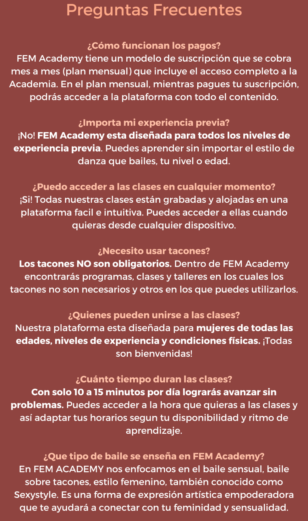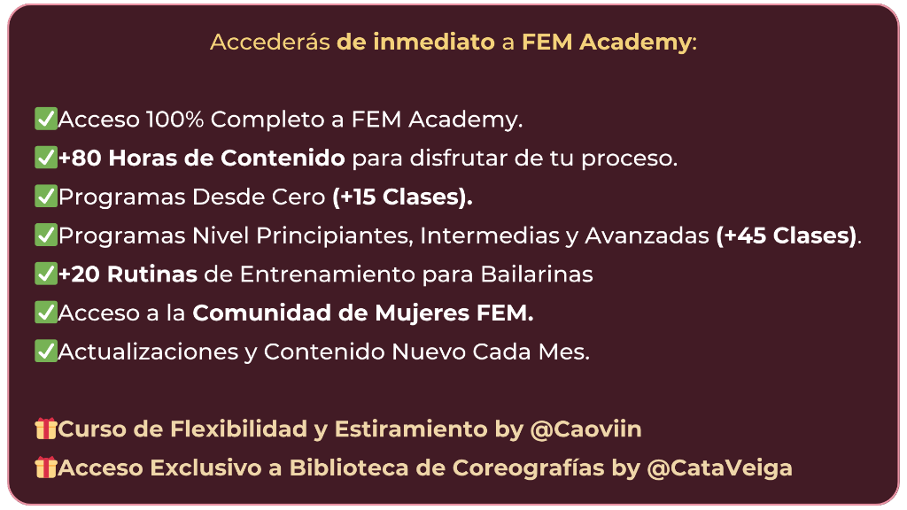 Siempre consulte a su médico antes de comenzar cualquier programa de ejercicios. Pueden ocurrir lesiones de todo tipo al participar en ejercicios, programas de acondicionamiento físico y entrenamiento. Al realizar cualquier ejercicio físico, lo hace bajo su propio riesgo. FEM Academy no será responsable de ninguna lesión, pérdida, daño o daño que cualquier persona sufra como resultado del programa de acondicionamiento físico, los videos de acondicionamiento físico en línea o la información compartida en este sitio web. El baile sobre tacones no es apto para quienes tienen o padecen alguna dolencia física como espalda, cuello, lesiones musculares u otros problemas médicos relacionados. El baile sobre tacones tampoco es apto para mujeres embarazadas y no se recomienda a menores de 18 años. Este contenido, información, videos, audio y manuales de capacitación que se ofrecen y se ponen a disposición en este sitio web tienen fines únicamente educativos. Utilice esta información bajo su propio riesgo.