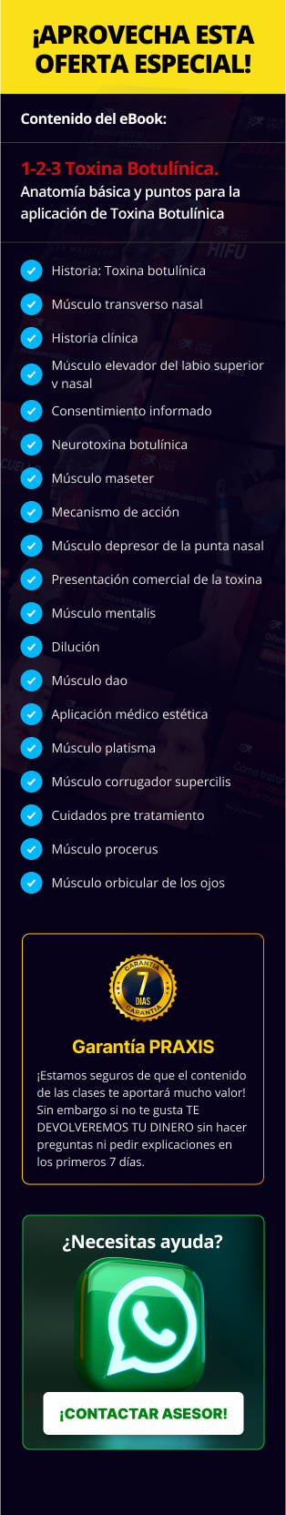 🎯 Transforma tu práctica estética con este combo exclusivo de 3 entrenamientos de alto impacto Conviértete en una profesional más preciso, seguro y con resultados naturales dominando estas 3 técnicas clave: ✅ Microdosis de toxina botulínica para armonización facial: logra rostros más equilibrados y expresivos sin perder naturalidad. ✅ Técnicas avanzadas de aplicación de ácido poliláctico sculptra en cara y cuello. ✅ Lifting en 8 puntos para el tratamiento de los surcos nasogenianos: domina un