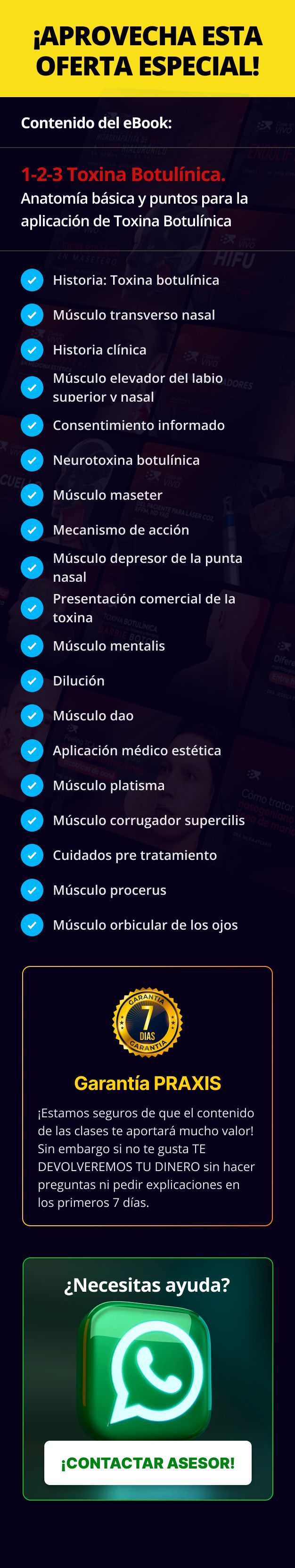 Estos Ebooks son la recopilación de más de 14 años de experiencia de nuestros SPEAKERS, en los cuales te entregarán tips, técnicas, PROFUNDIZACIÓN anatómica, prevención y manejo de complicaciones y mucho más. Lograrás reducir tu curva de aprendizaje, evitando las complicaciones y los resultados frustrantes en tus pacientes. 1. Toxina Botulínica 2. Relleno de labios con Ácido Hialurónico 3. Hidroxiapatita de Calcio en AOF 4. Prevención y manejo de complicaciones