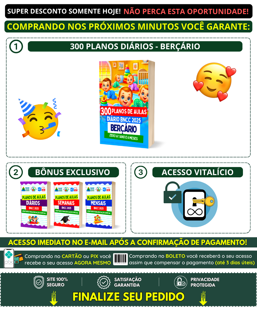 Desenvolvemos 400 atividades anuais mais completas do Brasil, 100% alinhadas com a BNCC. Oferecemos tudo em PDF e Word editável, com todas as disciplinas para facilitar sua vida. Nossas atividades atendem ao Berçário, Maternal e Pré-escola. +6 Bônus exclusivos, que são: ➡️150 Planos de Aulas Diários ➡️105 Planos de Aulas Semanais ➡️45 Planos de Aulas Mensais ➡️100 Sequências Didáticas ➡️+100 Atividades Dinâmicas ➡️Todos as atividades em WORD ➡️Gabaritos das atividades 😱 SOMENTE AGORA!