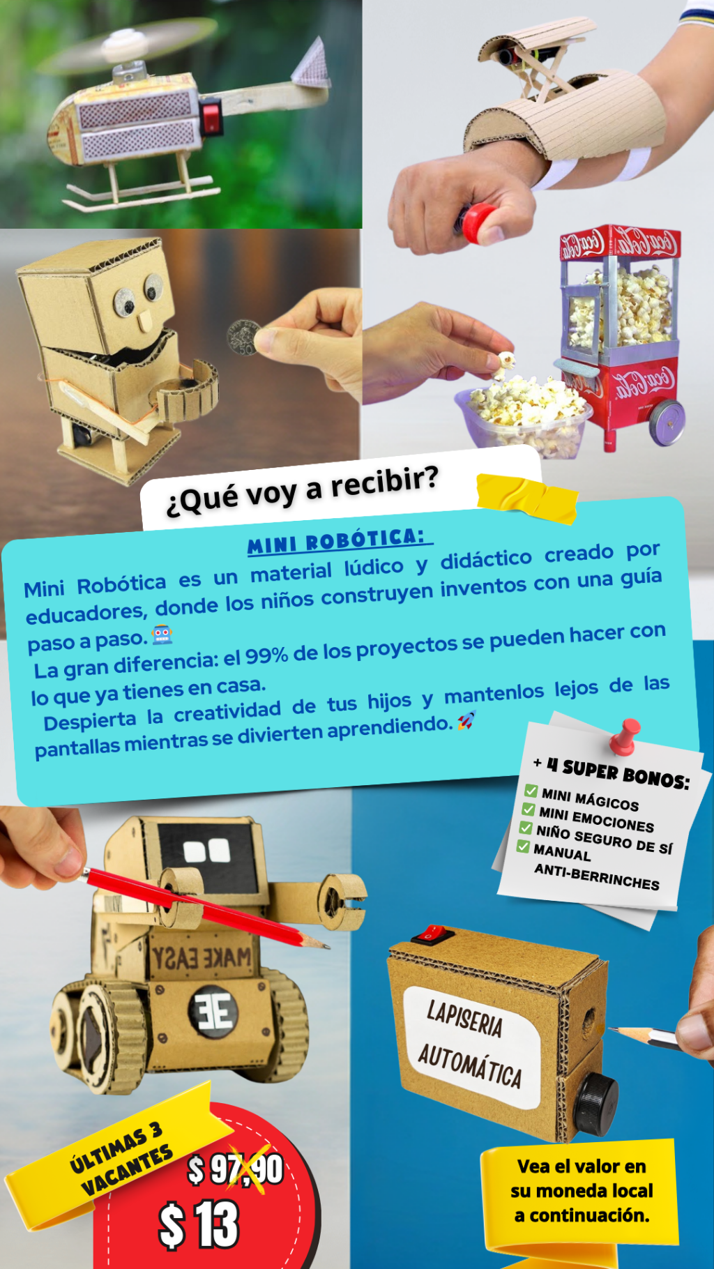 Descubre la magia de ver a tu hijo involucrarse en actividades llenas de pura creatividad, usando sus manos para recortar, inventar y explorar el fascinante mundo de **Mini Ingenieros**. Imagina la alegría en su carita al desarrollar nuevas habilidades y sentirse orgulloso con nuestros juguetes caseros súper divertidos. Mini Ingenieros ya ha transformado la vida de más de 43 mil niños, liberándolos de la dependencia de las pantallas y aliviando la ansiedad infantil.