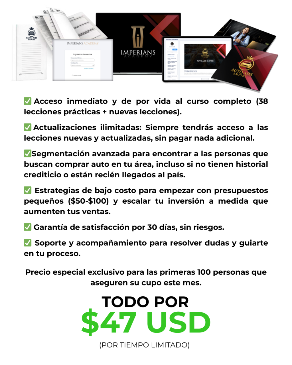 Auto ADS Empire es un curso 100 % en español diseñado para vendedores de autos en Estados Unidos que quieren generar un flujo constante de clientes potenciales y aumentar sus ventas utilizando campañas de Facebook e Instagram.