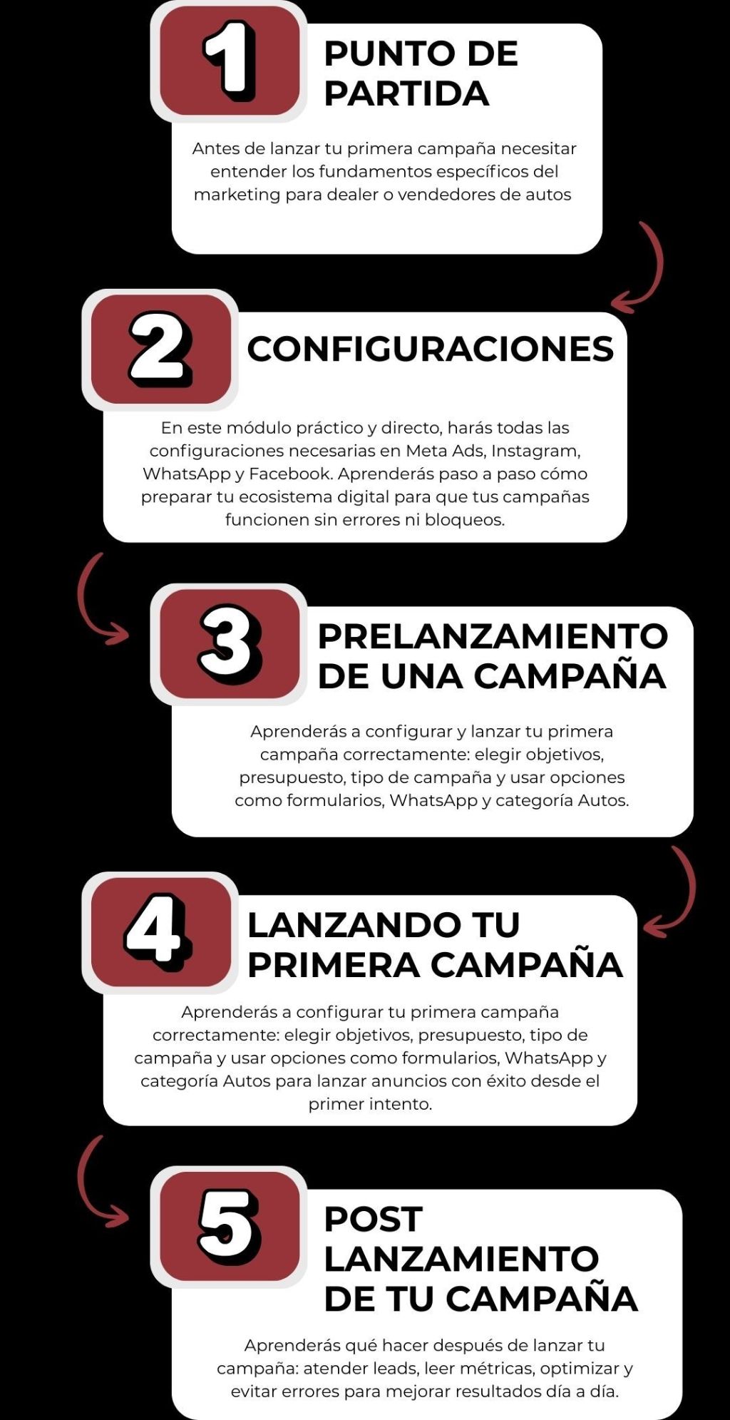Es una formación práctica, paso a paso, creada específicamente para quienes venden autos y necesitan un sistema predecible para generar oportunidades todos los días, sin depender solo del tráfico físico o los referidos.
