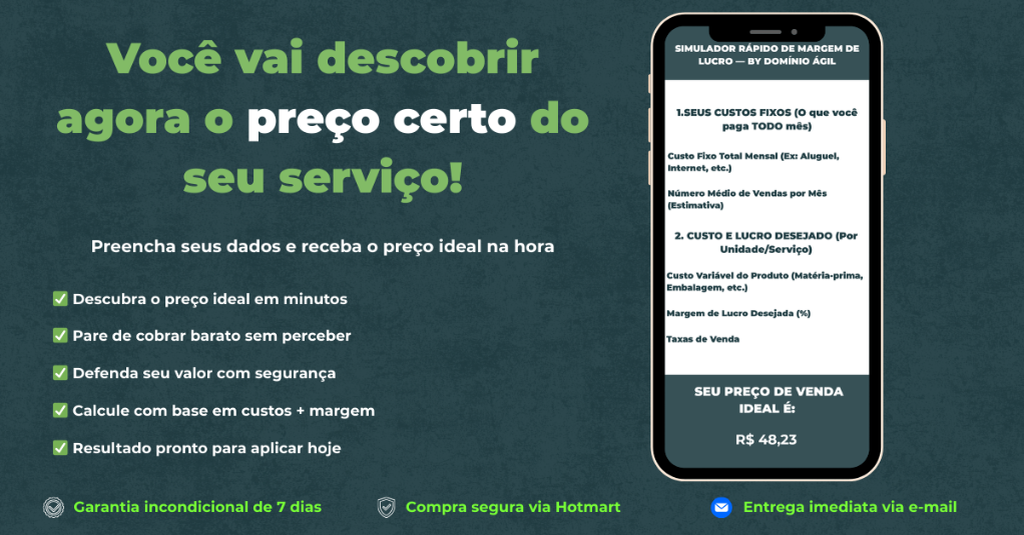 Você está a poucos segundos de enxergar seu preço certo. Finalize abaixo para receber a Calculadora Ágil do Preço Ideal no seu e-mail imediatamente.